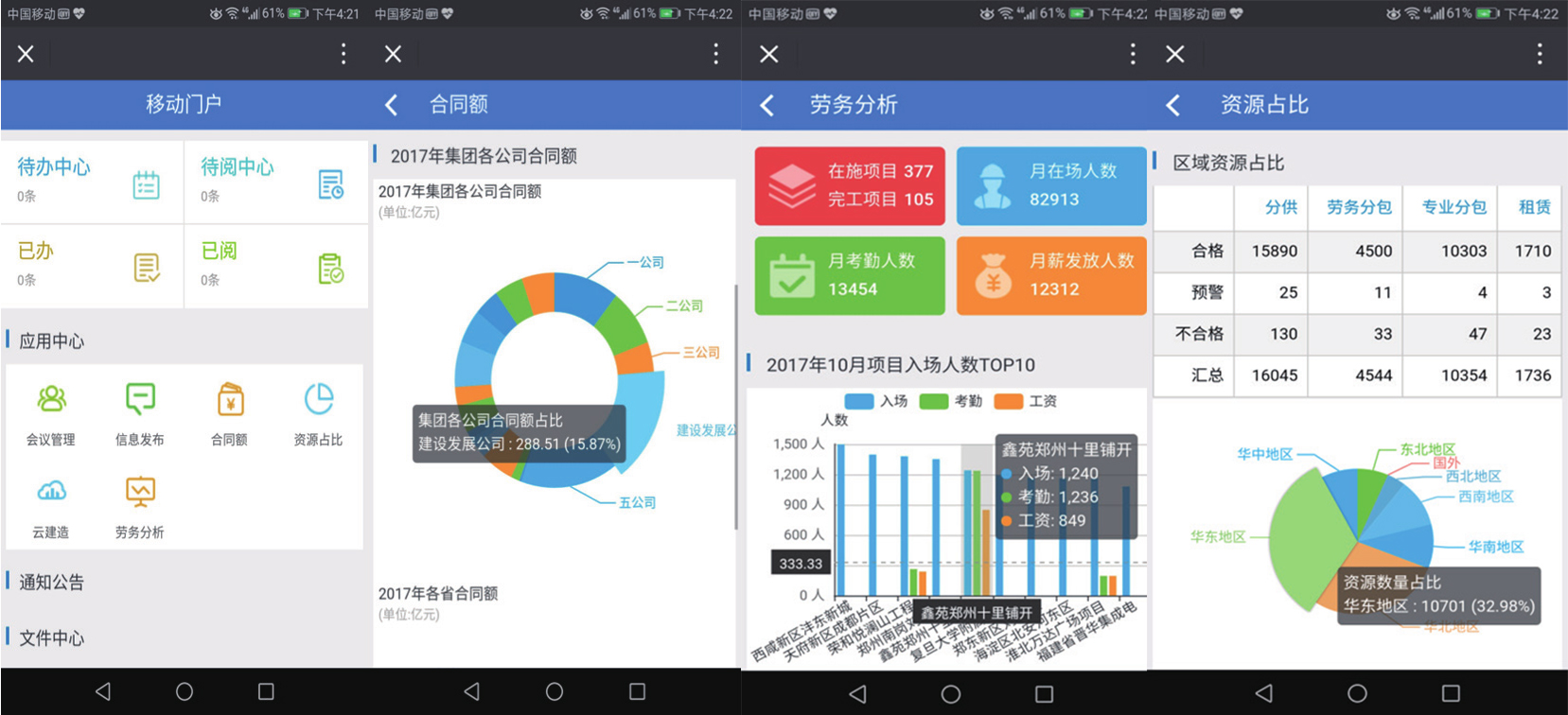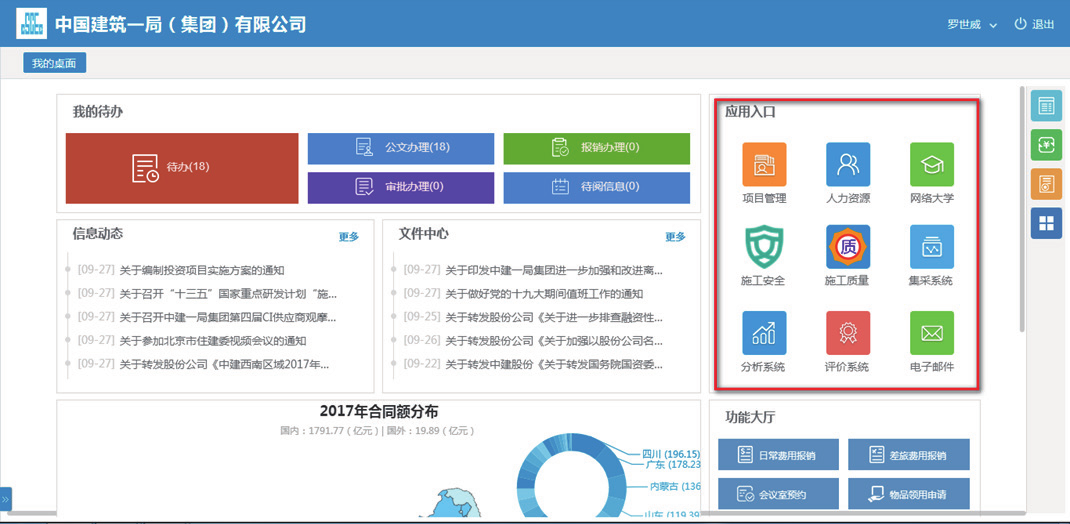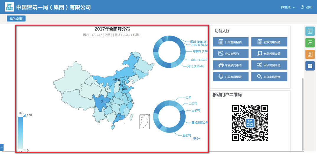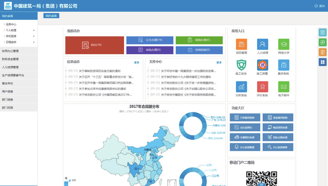 中建一局在 2007 年与银河集团(galaxy)合作,部署实施了协同办公平GLinkWorks4.3,随着信息技术的发展及公司业务的需要,在 2017 年升级到了 GLinkWorks7.0。并在此基础之上,依托银河集团(galaxy)提供的“协同 +”能力将各业务系统连接,以OA 组织架构为先决条件实现了单点登录、代办聚合、功能聚合;基于异构系统数据库统一,实现数据整合及业务应用为一体。通过异构系统的数据库开放,门户系统将各业务系统重点数据钻取、分析、统计,所生成结果以报表形式展现在各级门户上,同时结合 PC 端移动端数据同源,实现了随时随地随手办公的效果。真正为员工提供了快速发起通道,为辅助领导决策提供了有力支撑,最终实现集中管控业务、提供市场核心竞争力。
