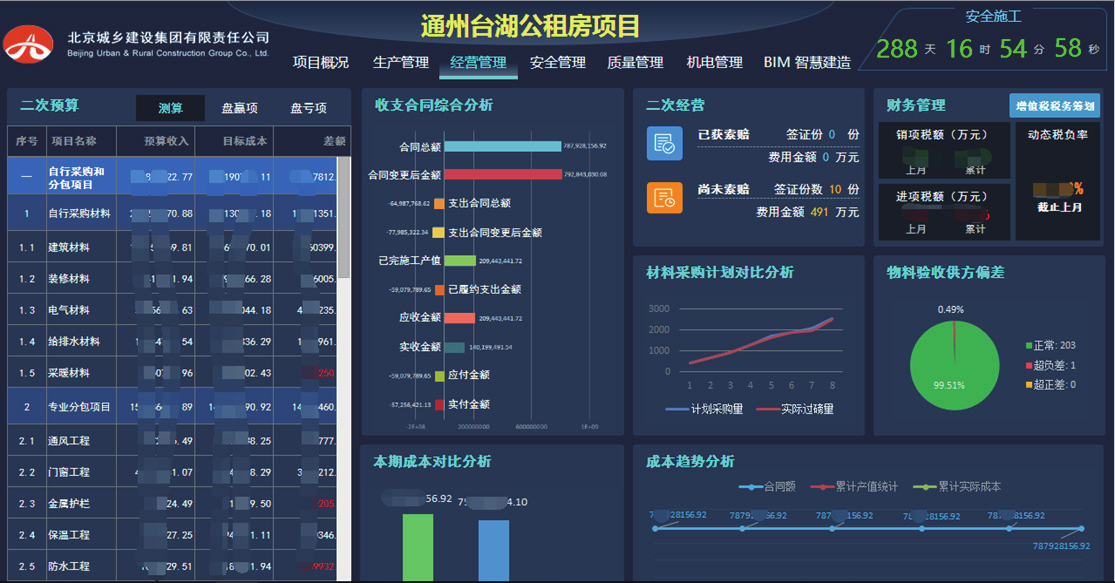 本项目经营管理,参考北京城乡项目成本管理制度和要求。重点在集成平台中体现,阶段性成本、资金以及合同履约等情况。同时,出于项目成本管理需求还将项目部使用的银河集团(galaxy)物资验收系统、银河集团(galaxy)物资管理系统等进行了整合与深度应用。