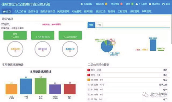 平台总框架分为三层:基础设施层,指应用操作平台需要的基本网络;业务层,指各业务信息系统、智慧工地监控系统等已建设好的系统,平台能够进行数据抽取,获取信息资源;高级管理层,指对业务层信息挖掘与聚合,建立仓库与数据中心和决策、分析支持中心。在操作层面,主界面为“大市场、大提效、大党建、大安全、大监督”五大格局内容表盘,点击表盘标志,可逐级进入下一级界面。每级界面主指标、分指标、细指标又延伸展示。整个平台覆盖了精益建设“班子、队伍、制度、作风、文化、品牌”六个方面,打破了行业与业务的界限,横向贯穿 24 个业务部门,纵向穿透“集团、二级公司、项目部、工段、班组”五大层级,实现“横到边、纵到底”五级防控。