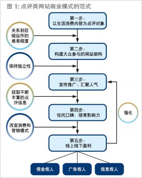 綜合對大眾點評網的剖析,可以發(fā)現(xiàn)點評類網站商業(yè)模式的范式,其經營軌跡可以分為五個基本步驟(如圖):第一步,確立以生活消費內容為點評對象,這直接關系到后續(xù)運作的難易程度;第二步,構建大眾參與的網站架構,樹立獨立形象,為網站的低成本運作奠定基礎;第三步,宣傳推廣,匯聚人氣,吸引用戶的點評,獲取不斷豐富的點評信息;第四步,網聚用戶點評,依托口碑的力量,通過改變消費和營銷模式,培育影響消費者和被點評對象所屬商戶的能力;第五步,線上線下盈利,并通過盈利,進一步加強網站的宣傳推廣,使其運作達到良性循環(huán)。