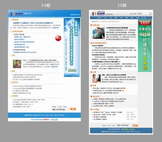 其實(shí)友商聯(lián)線(xiàn)15期和14期,在風(fēng)格設(shè)計(jì)上是近似的,都是商務(wù)風(fēng)格,簡(jiǎn)潔大方,藍(lán)色調(diào)子,右邊為廣告區(qū)域。視覺(jué)設(shè)計(jì)并沒(méi)有新的改觀和體驗(yàn)。