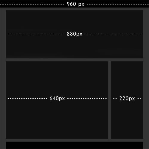 從上述簡單的布局中,我們可以看到如何在css中規(guī)劃代碼。960px是我們的固定寬度,對于任何小于該尺寸的分辨率屏幕,我們將迫使水平滾動條出現(xiàn)。所有內(nèi)容在一個880px的wrapper里,在左右兩側(cè)有40 px的margin,元素間有20px的間距。
