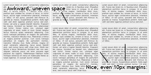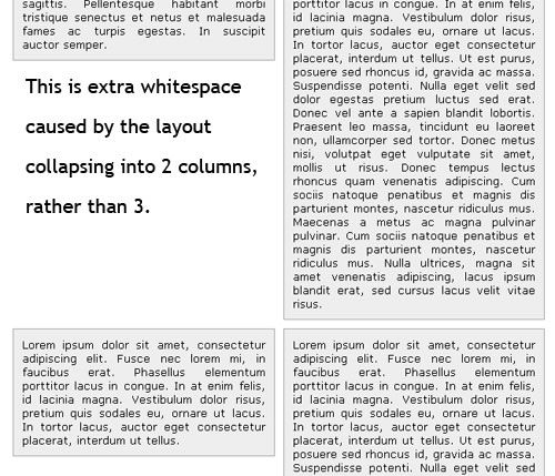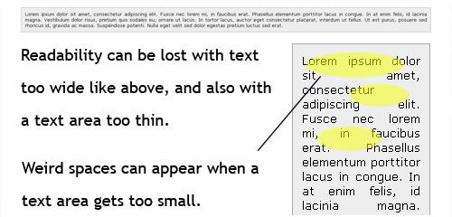 另外一個流動布局關(guān)注的常見問題是:文本要么伸展要么擠壓以致失去了可讀性。下面的這張圖片表明了這個問題,無論是在大屏幕還是在小屏幕上都是一樣,在小屏幕上似乎問題更大--文本間隙太大,上面這些情況都令用戶沮喪。