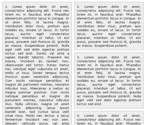 不去考慮不斷改變屏幕分辨率時css中的存在的許多問題。倒有一個共同的問題是許多設(shè)計(jì)師更可能面臨的--多重內(nèi)容盒子。當(dāng)有許多浮動元素時,一些尷尬的空白會出現(xiàn)在高度變換的區(qū)域之間,下面是這方面的一個例子: