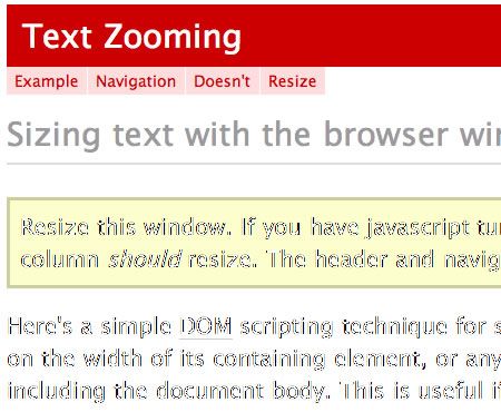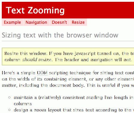 要看實(shí)際效果,可以到他的Text Zooming page. 頁。正如你所看到的那樣,腳本很好的退化,在較大分辨率屏幕上大文本容易閱讀,就像在小屏幕上小文本易于閱讀一樣。更重要的是,標(biāo)題和導(dǎo)航并不改變大小,所以元素可以決定那個元素應(yīng)當(dāng)使用文本縮放。