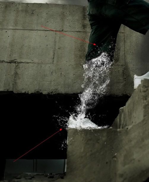 我們將下載的素材進行適當?shù)淖冃纹春?,形成左腿的形狀,注意邊緣的飛濺效果,這樣才有動感和真實感,如圖