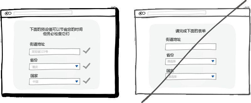 適當(dāng)?shù)哪J(rèn)值和預(yù)先填充好的表單字段可以大量減少用戶的工作量。在節(jié)省用戶寶貴的時(shí)間上面,這是種非常常見的做法,可以幫助用戶快速填完表單或者注冊(cè)信息。