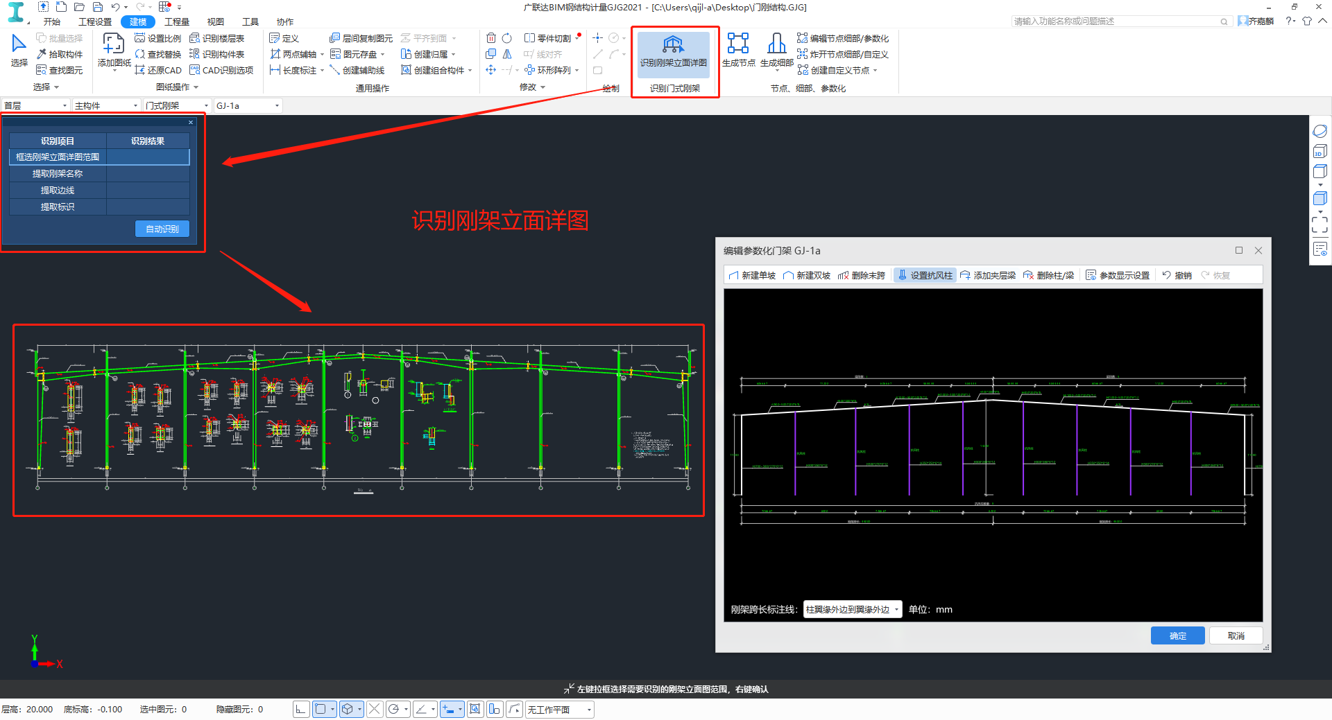 导入门式刚架图纸,提取刚架的高度、跨度、坡度、柱梁规格等信息,自动识别门式刚架构件。