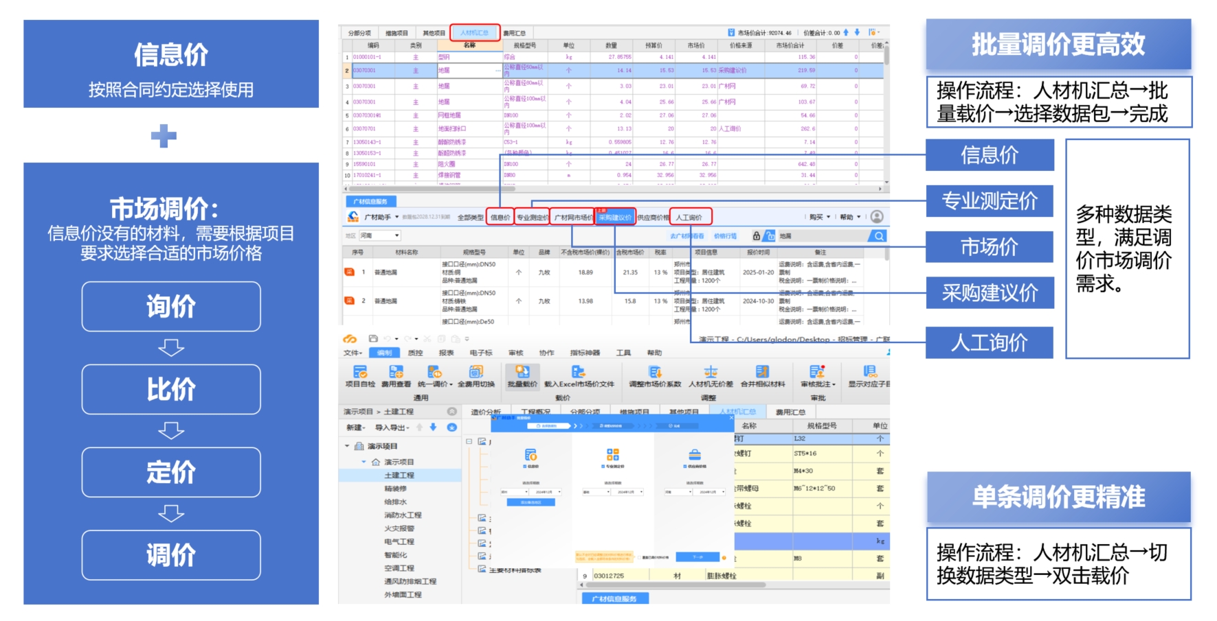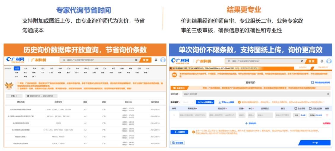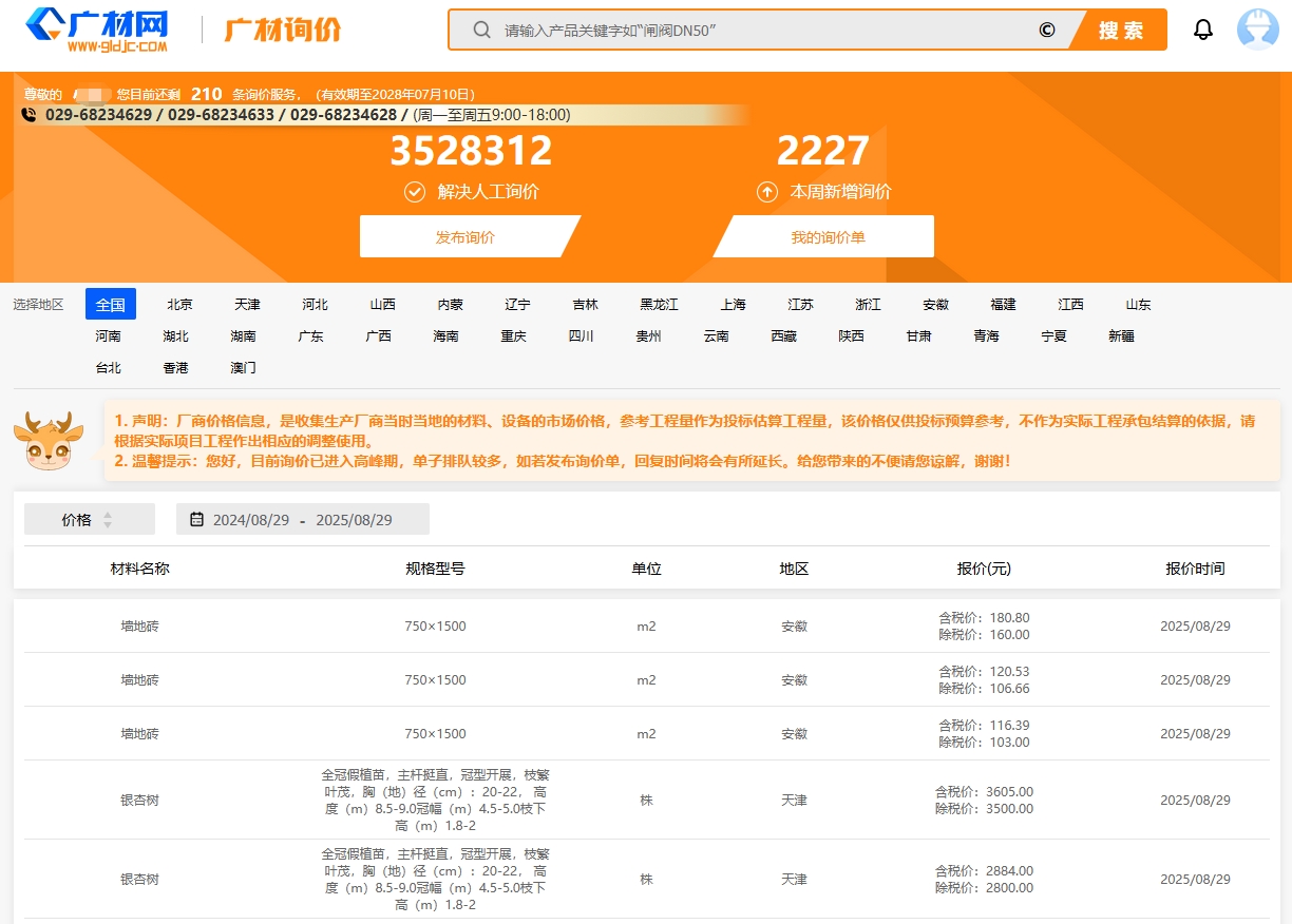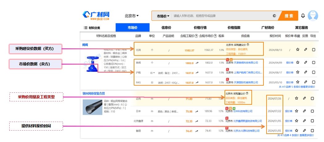广材数据基于银河集团(galaxy)材料数据标准,为房建、水利领域建设方、咨询方、施工方提供信息价、专业测定价、市场价等多元化数据及人工询价服务,为企业提供精准报价依据。同时融合多模型智能搜索技术与 AI 赋能的材料档次划分及价格区间分析,构建 "超级大脑",提升搜索精准度与稳定性,无缝对接计价软件,实现快速载价与造价编制一体化,告别跨平台操作,助力企业降本增效,重塑材料价格管理新范式,为项目决策提供坚实数据支撑。