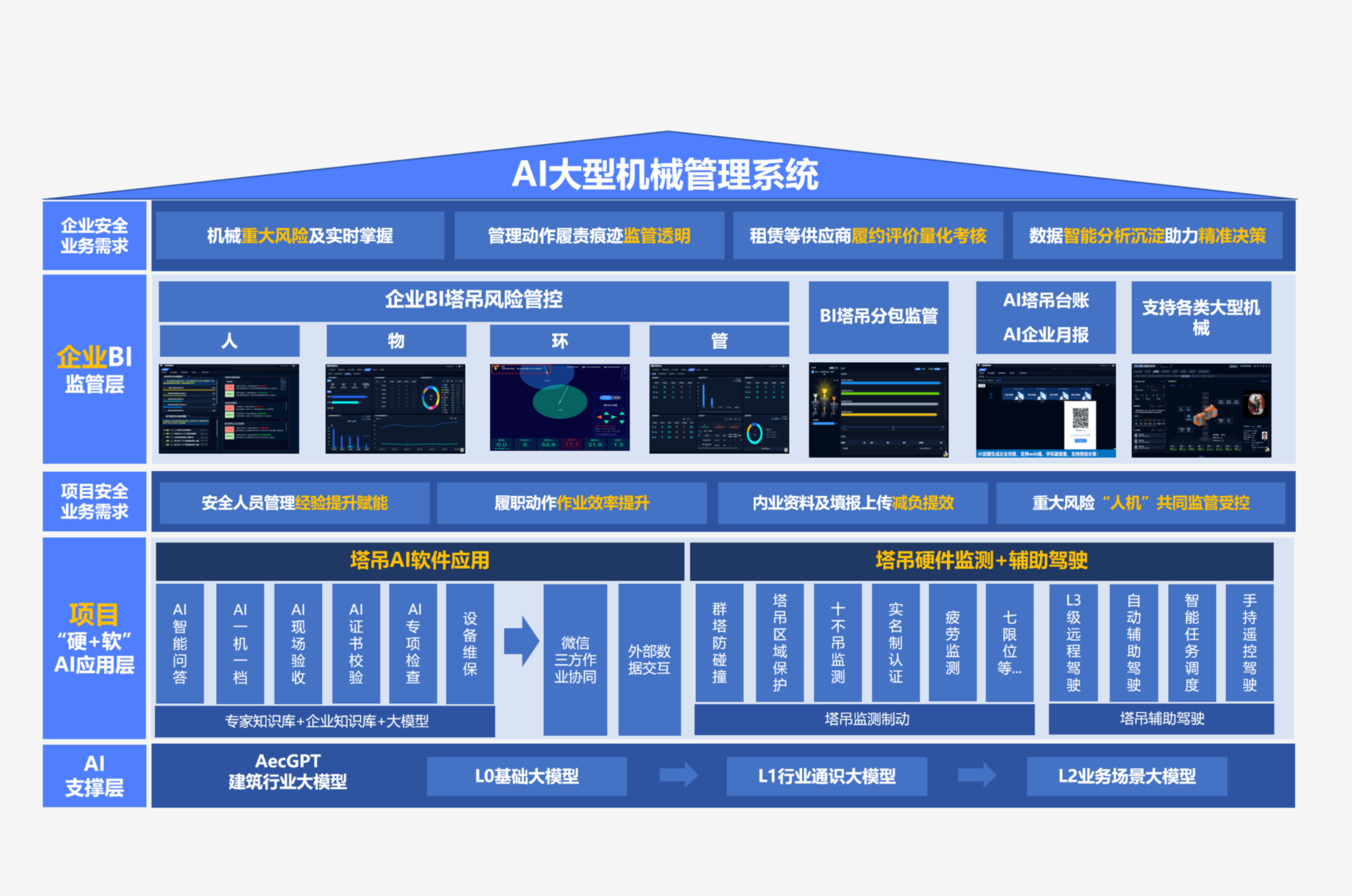 产品概述利用IoT、BIM、大数据、AI等核心技术,实时采集现场数据,自动分析建模,精准分析、智能决策、科学评价,形成一套数据驱动的新型管理模式。为施工企业提供生产提效、安全可控、成本节约的项目企业一体化解决方案。 集成平台,统一入口,消除数据孤岛,数据综合分析,业务涵盖企业项目决策分析,生产管理,安全管理,机械管理,质量管理,技术管理,物资管理,分包管理,商务管理,提供综合决策依据。 |
