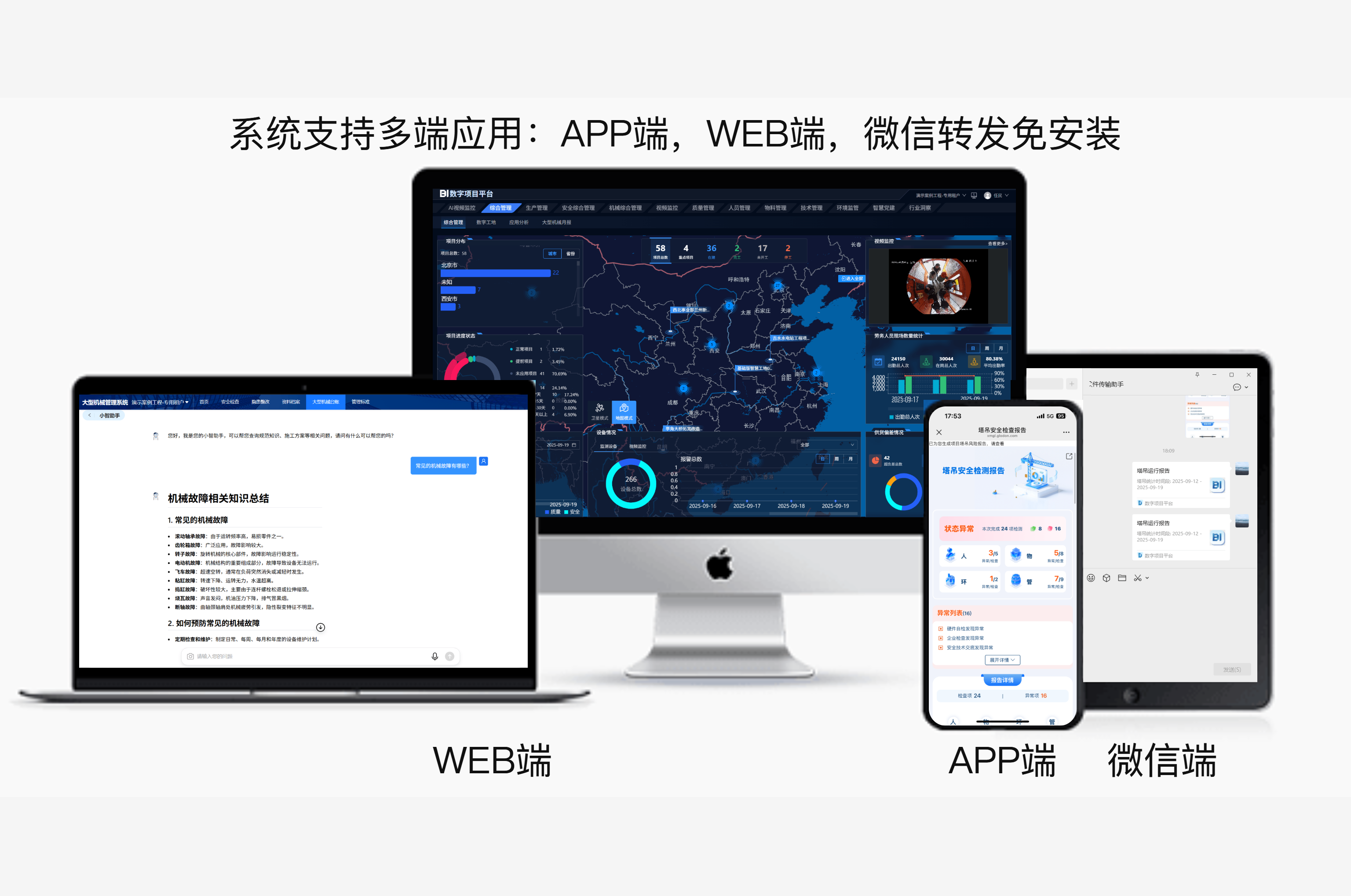 系统支持多端协同互通,高效管理一套系统,多端覆盖。支持APP、WEB及微信端无缝切换,随时随地掌控工地动态。 无论是电脑端擅长的数据分析和深度操作、手机移动巡查,还是微信扫描二维码开展检查、一键转发《塔吊风险报告》《项目每日简讯》等,都能轻松实现。让协同更便捷,决策更高效! |
