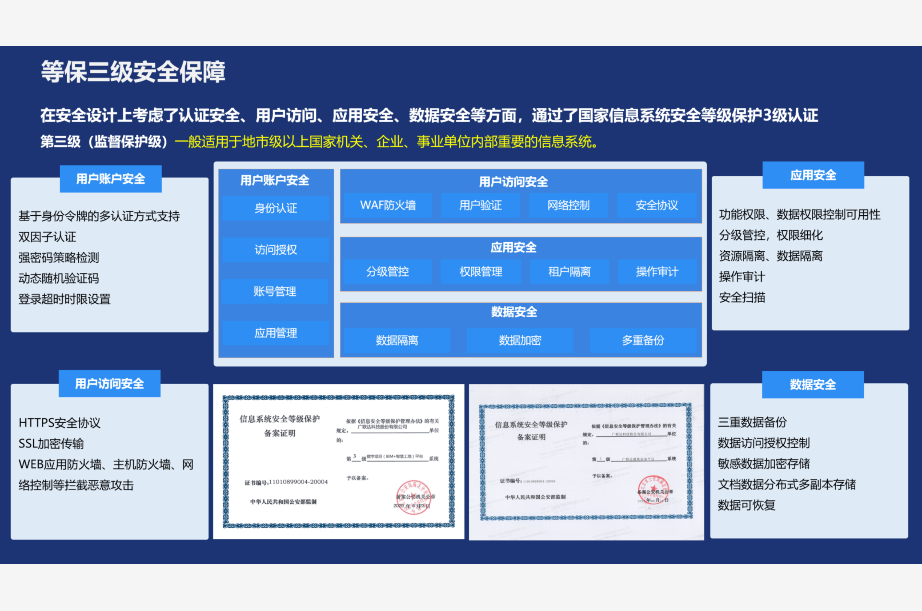通过国家信息系统安全等级保护3级认证-全方位安全保障在安全设计上考虑了认证安全、用户访问、应用安全、数据安全等方面,通过了国家信息系统安全等级保护3级认证;第三级(监督保护级)一般适用于地市级以上国家机关、企业、事业单位内部重要的信息系统。 |