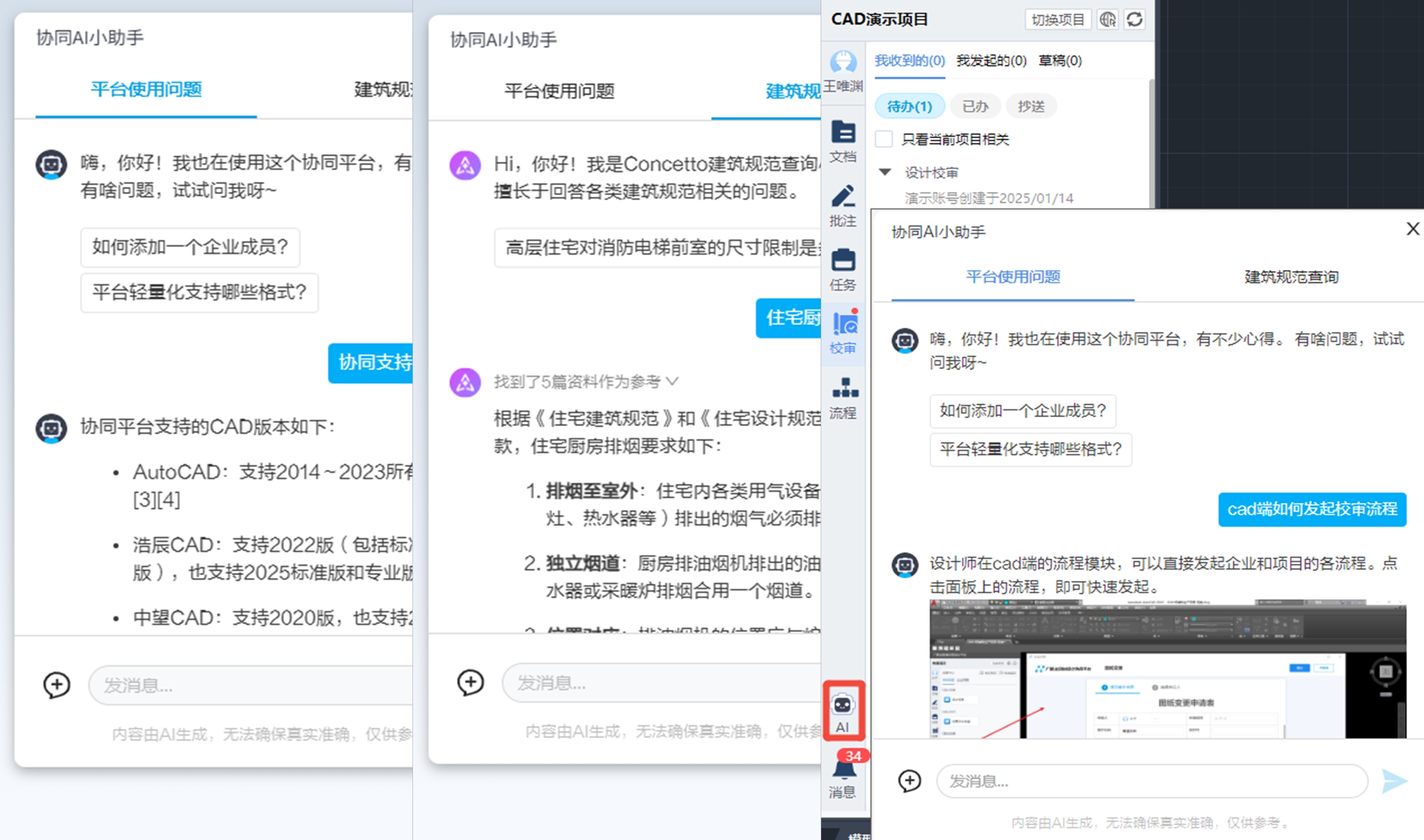 AI 智能问答模块,实时响应设计全流程需求。功能操作疑问、建筑规范解读一键提问,精准解答无需等待,为设计工作提供专业技术支持