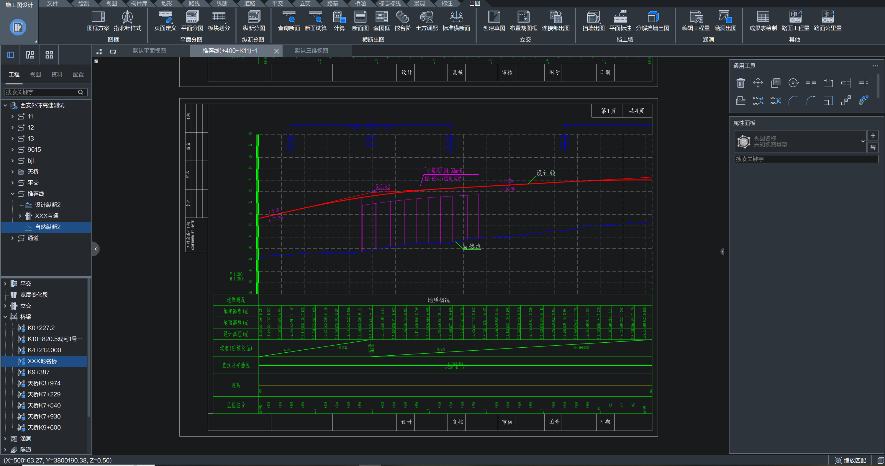 纵断出图选择任意起终点、按设置的平纵比例、图框大小、表头栏、线型、网格等输出符合院风格的纵断面图及平纵缩图,通过样式设置灵活定制出图风格并可联动刷新、配置的样式可导入导出,纵断面图可二次自由修改、经多地区市政道路和公路对比,达到出版要求 |