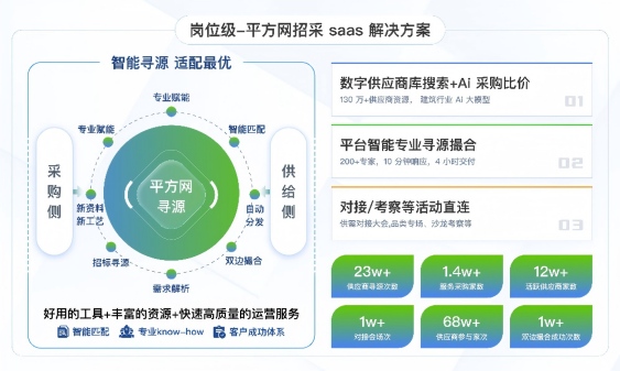 岗位级-平方网招采 saas 解决方案面向采购岗、招采管理岗,提供高效寻源与供应商管理工具,130万 + 在线供应商库含资质、业绩、实地认证信息,支持全品类检索,1:3 智能推荐供应商,10 分钟响应需求;多渠道拓源,招募考察全流程支持。显著提升岗位作业效率,节省寻源时间,降低采购成本。 |