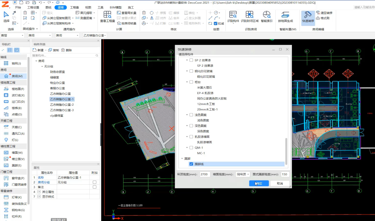 对于装修相同的房间,可以按照房间边线的形状快速生成地面、踢脚、墙面和天棚图元。解决批量装修项目,算量过程繁琐问题, 实现一键批量装修房间内天棚、墙面、踢脚等工程,快速准确出量,简单高效。