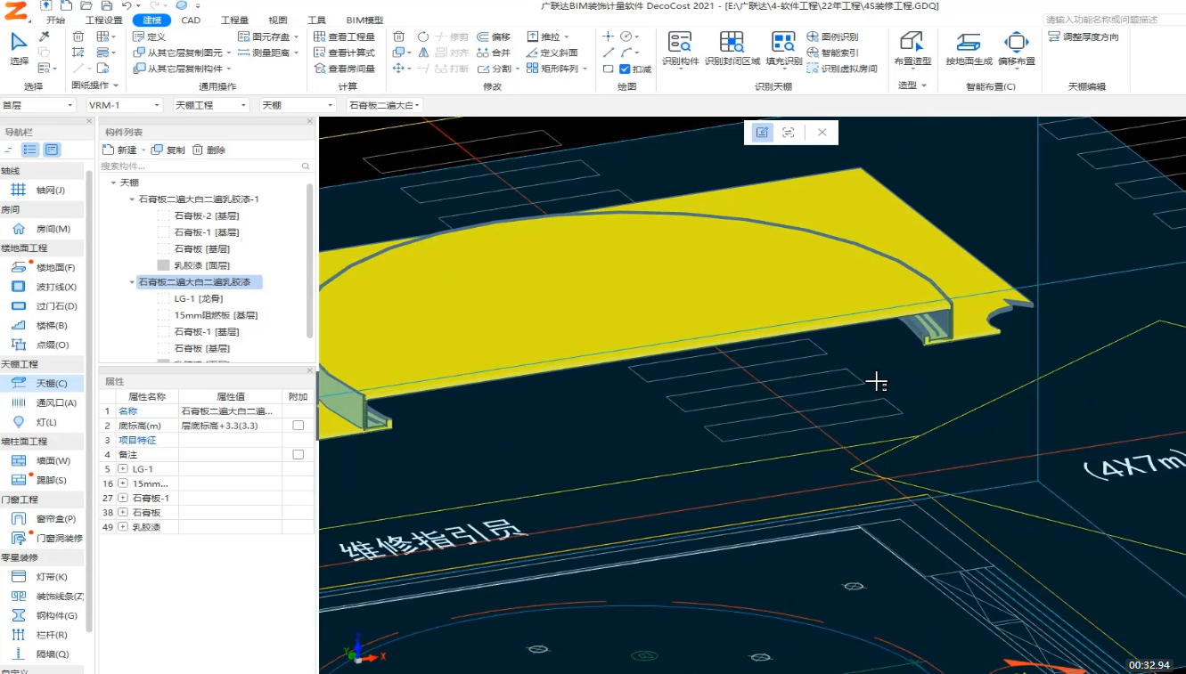 根据节点图,识别天棚节点、墙面节点、龙骨、灯带和装饰线条,根据材质和布置边线,生成指定的截面形状的造型。实现根据节点图快速可视化建模,精准计算造型工程量,并支持造型二次编辑以及数据持续复用。