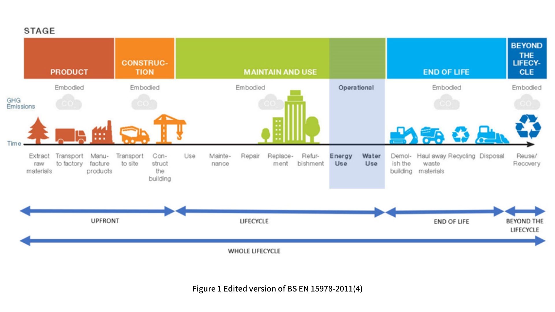 Let us first look at whole-life carbon emissions as explained by the equation provided below and illustrated in Figure 1.