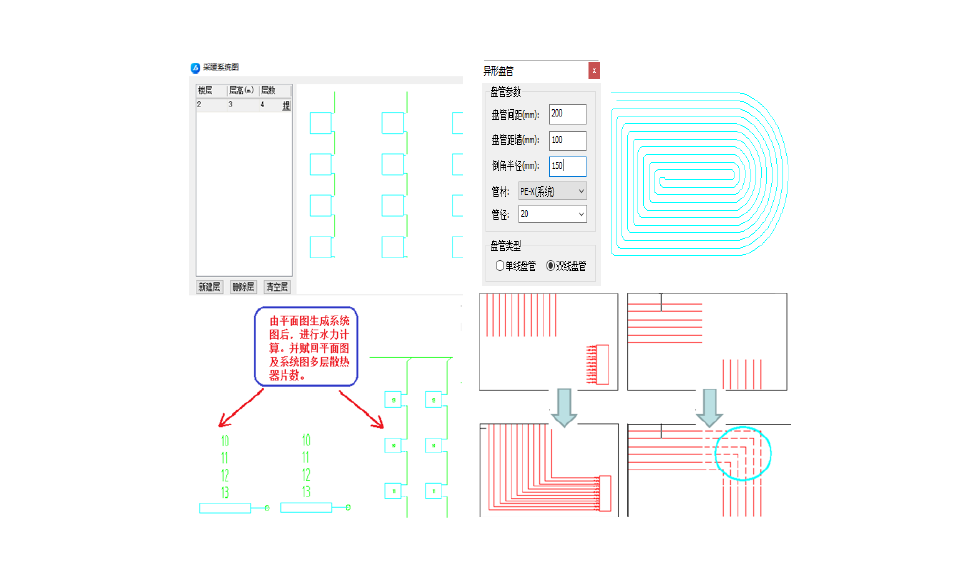 可快捷进行传统形式的采暖系统、分户计量系统的平面图、系统图设计;支持散热器与管道多种连接方式,平面图自动生成系统图;水力计算直接提取系统图进行水力计算, 计算后自动赋回平面、系统。
