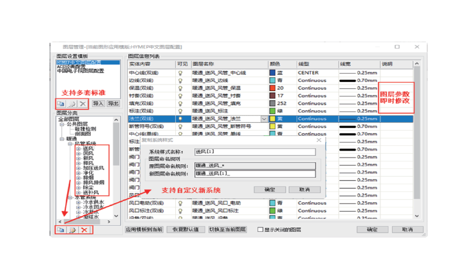 图层管理满足定制需求,并且基于图形保存机制,样式随图走,保证同一张图在不同机器上绘图样式的统一性;支持导入和识别 ACS10.0 的图层模板,支持增量更新。