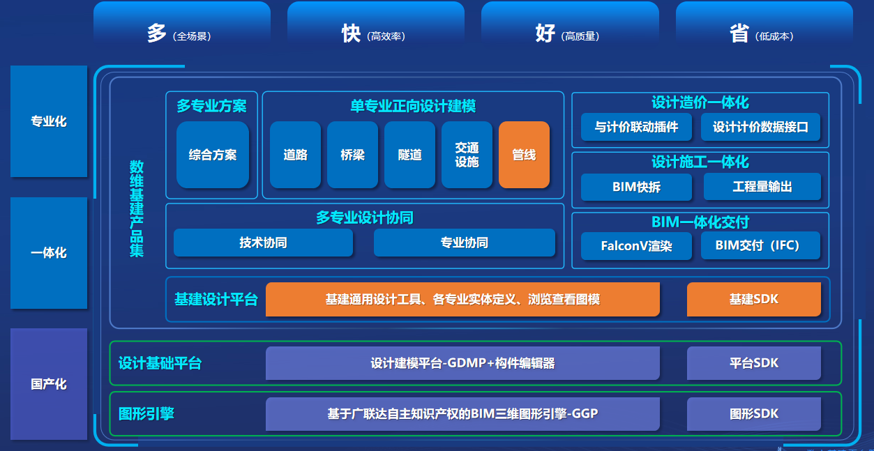 数维管线采用二三维一体的设计机制,可以在熟悉的二维模式下高效设计,同步创建真实的三维模型,真正实现设计、建模只做一遍,并基于模型完成施工图出图。