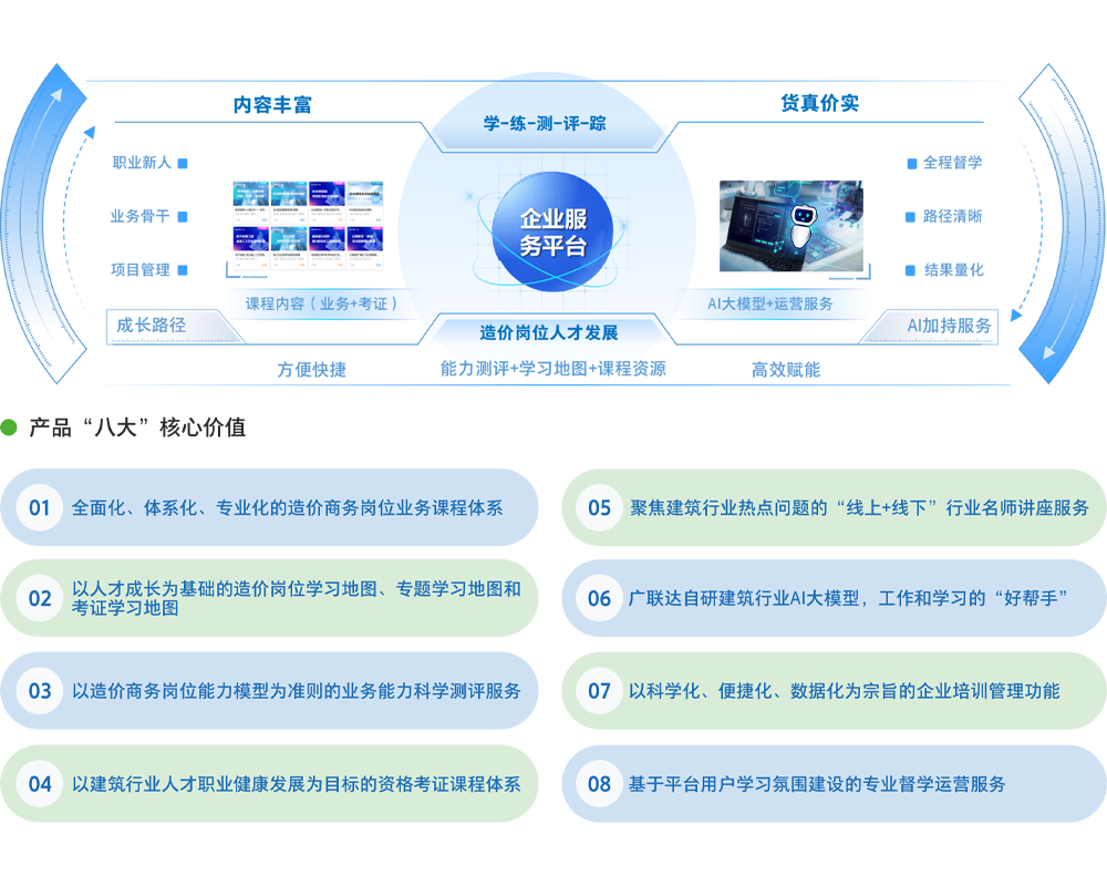 聚焦造价业务各层面的成长诉求,提供全面体系化的能力提升课程及职业进阶考证课程。通过场景化的学习路径/地图、全方位的岗位能力测评工具以及建筑行业垂直领域的AI知识问答,帮助商务人员快速提升业务能力,提高工作质量与效率,助力每一位建筑人有成就。